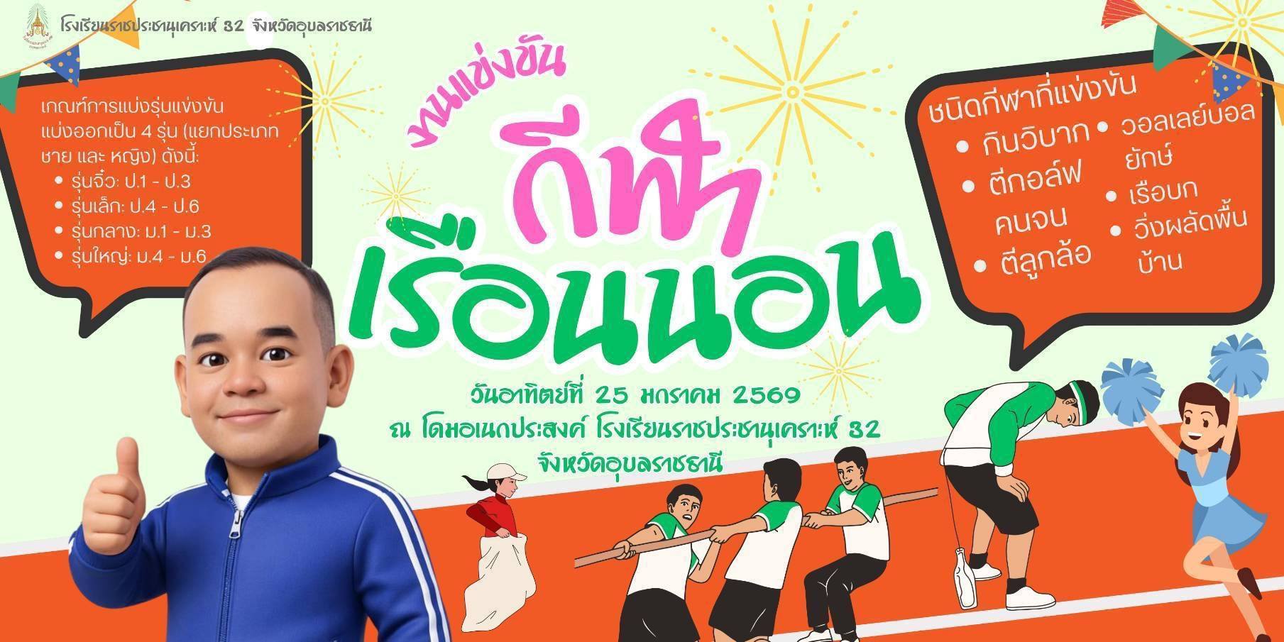 วันอาทิตย์ที่ 25 มกราคม 2569 โรงเรียนราชประชานุเคราะห์ 32 จังหวัดอุบลราชธานี นำโดยนายสัญญาแสนทีวีสุข คณะผู้บริหาร คณะครูและบุคลากร ได้จัดกิจกรรม กีฬาเรือนนอน “รวมใจเป็นหนึ่ง รวมพลังหอพักรักกันอย่างพี่น้อง” ประจำปีการศึกษา 2568 เพื่อเป็นการส่งเสริมสุขภาพกายและสุขภาพจิต สร้างความสามัคคีและความสัมพันธ์อันดี ปลูกฝังการทำงานเป็นทีม ฝึกระเบียบวินัยและการมีน้ำใจนักกีฬา ตลอดจนเป็นการส่งเสริมการสร้างบรรยากาศการอยู่ร่วมกันในเรือนนอน