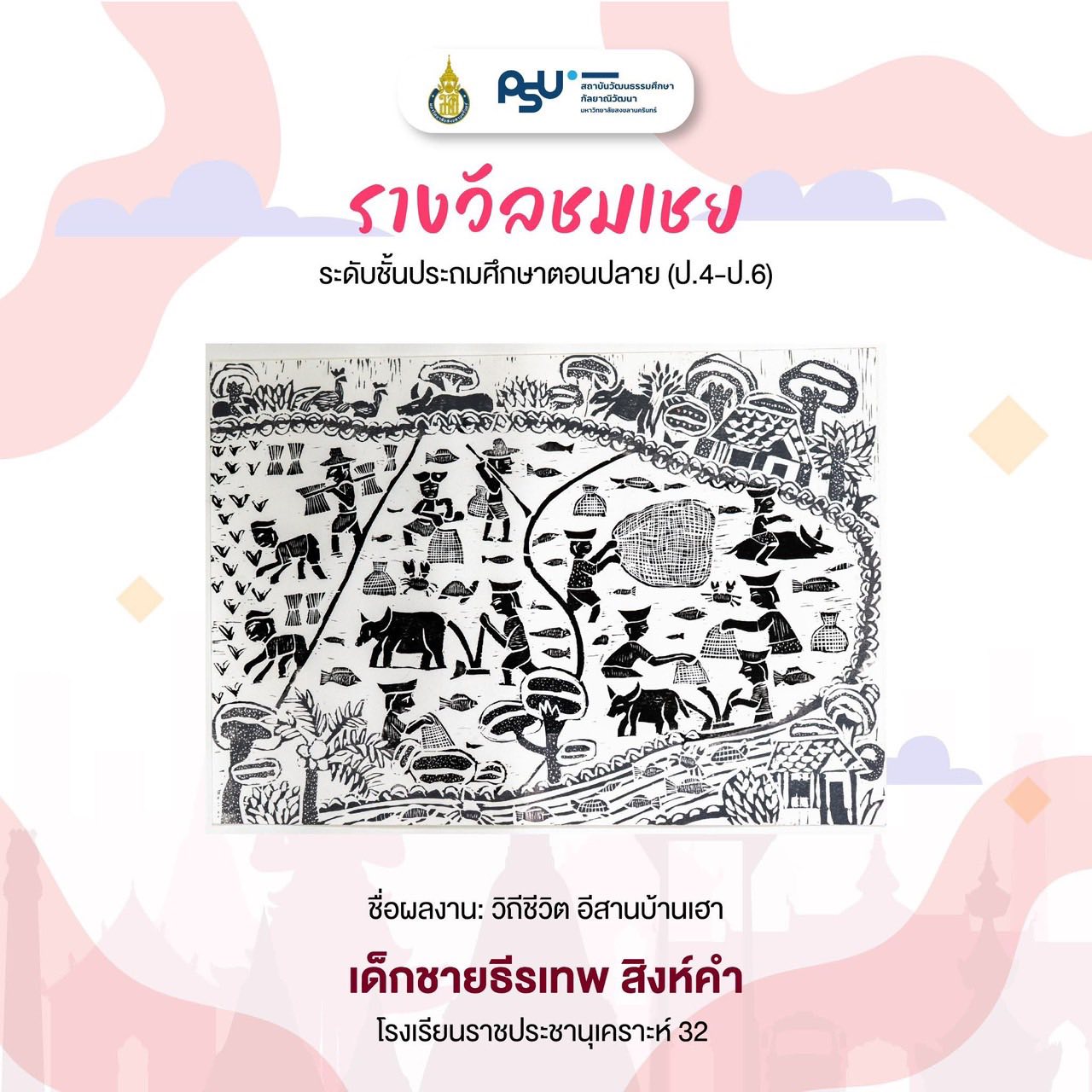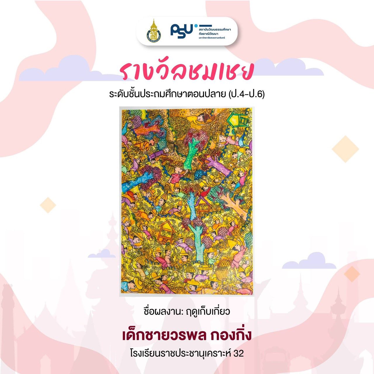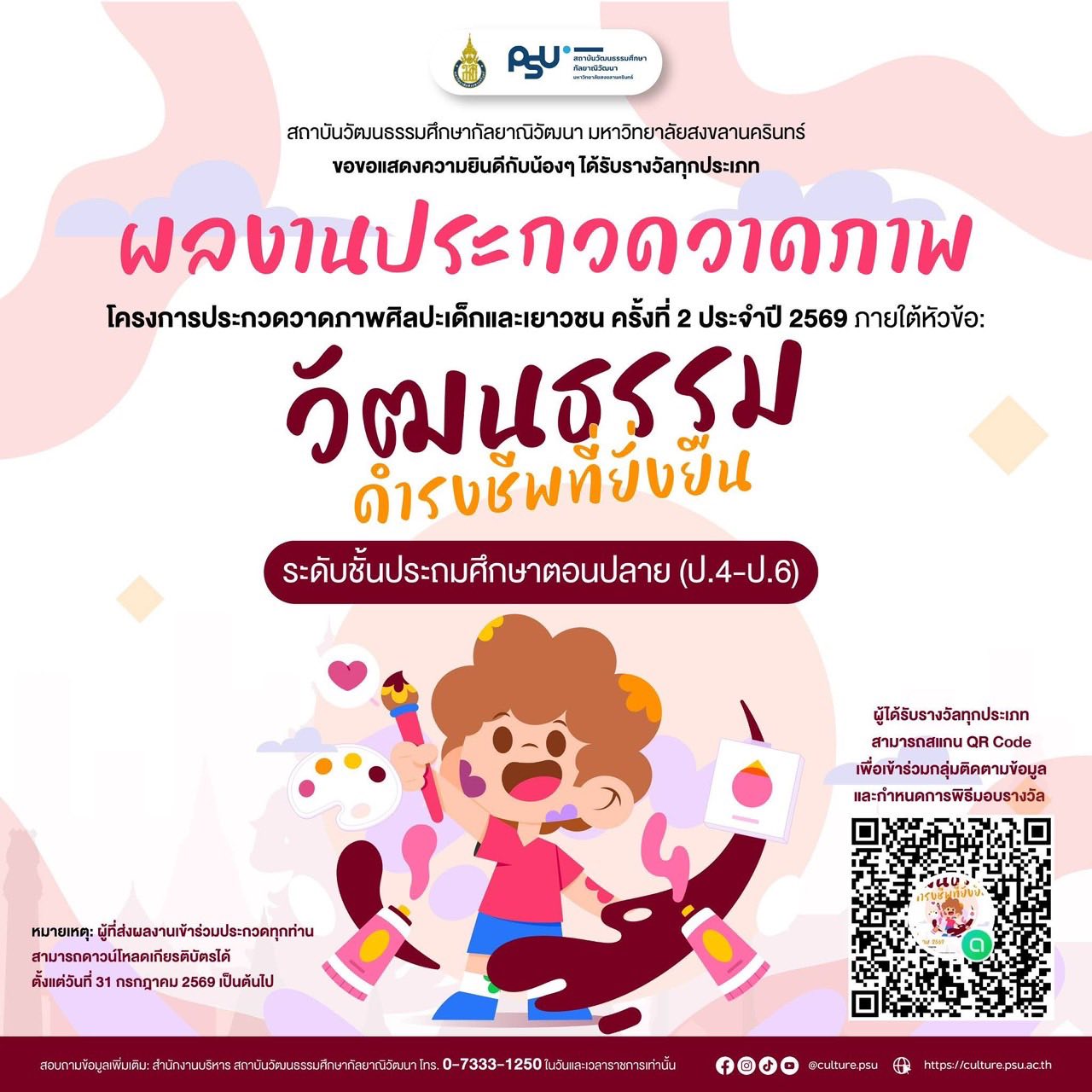 ขอแสดงความยินดีกับกลุ่มสาระการเรียนรู้ศิลปะ ได้ส่งผลงานนักเรียน ระดับประถมศึกษา เด็กชายวรพล กองกิ่ง (น้องพล) ชั้น ป.6,เด็กชายธีรเทพ สิงห์คำ (น้องเทพ) ชั้นป.5 เข้าร่วมแข่งขันการประกวดวาดภาพเด็กและเยาวชน ครั้งที่ 2 ประจำปี 2569 ภายใต้หัวข้อ “วัฒนธรรมดำรงชีพที่ยั่งยืน” จัดโดย สถาบันวัฒนธรรมศึกษากัลยาณิวัฒนา มหาวิทยาลัยสงขลานครินทร์